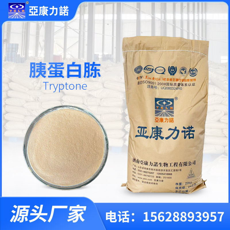 胰蛋白胨是一种优质的蛋白胨,是以优质蛋白质,经胰蛋白酶进行酶解后得到的。它能特异性地将蛋白质切割成中等长度的肽链和部分氨基酸,这种消化模式与酸解或其它酶解不同,产物的肽谱更集中,营养价值更高。富含各种氨基酸,特别是色氨酸和胱氨酸等含量较高。
